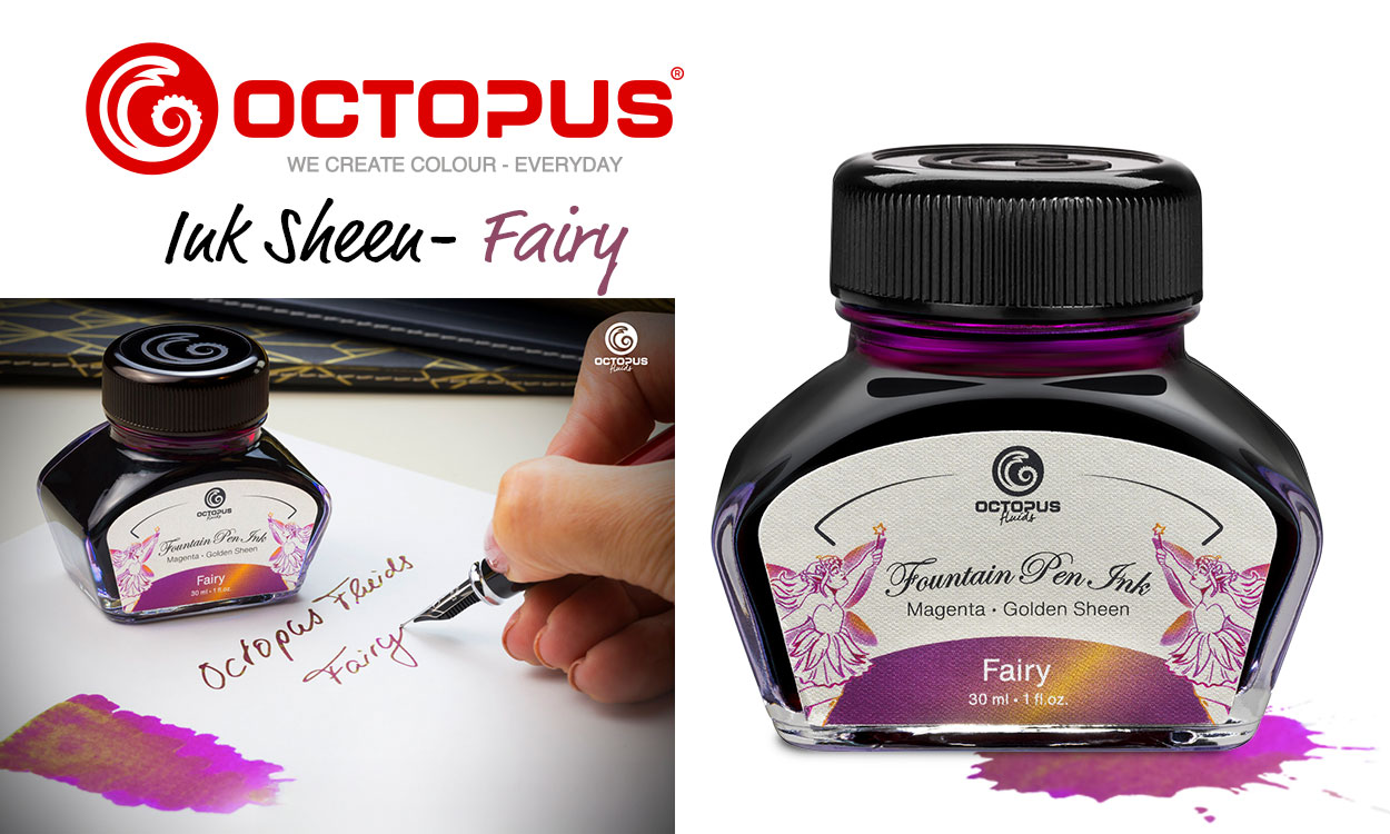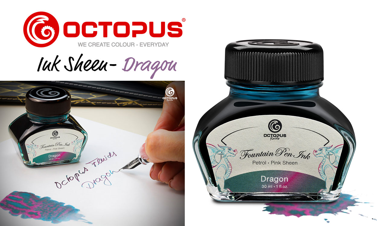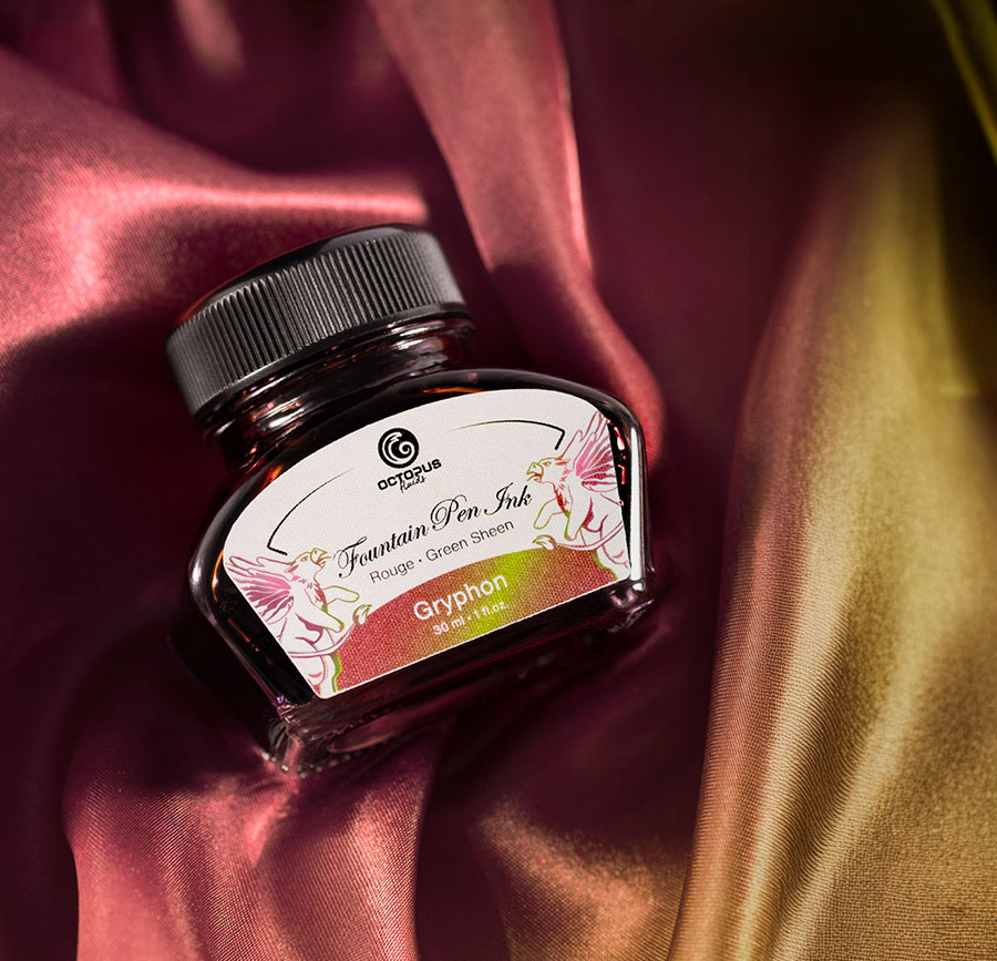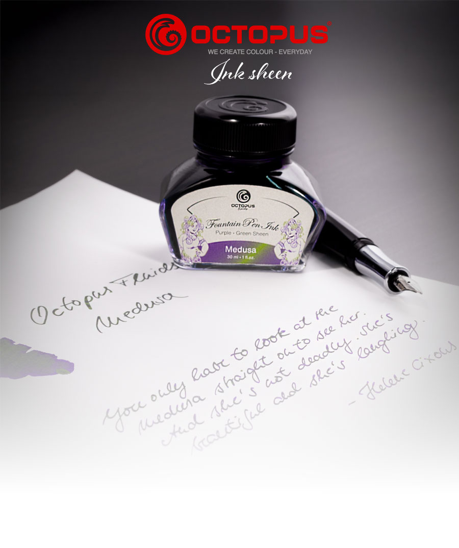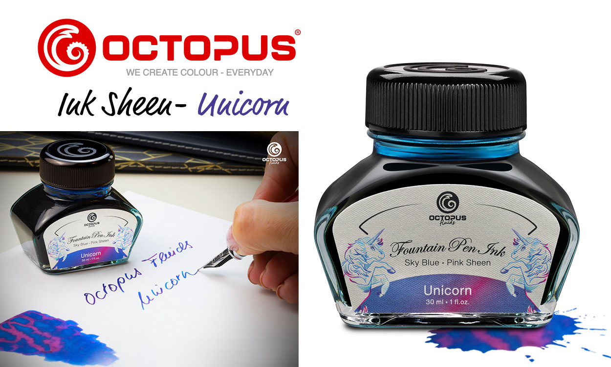 Prepárate para una experiencia de escritura fascinante. La colección Octopus Fluids Sheen, inspirada en criaturas míticas como el Unicornio o la Medusa, ofrece un espectacular efecto bitono: un resplandor metálico en tonos cobre, oro o rosa que flota sobre el color base y cambia según el ángulo de la luz.