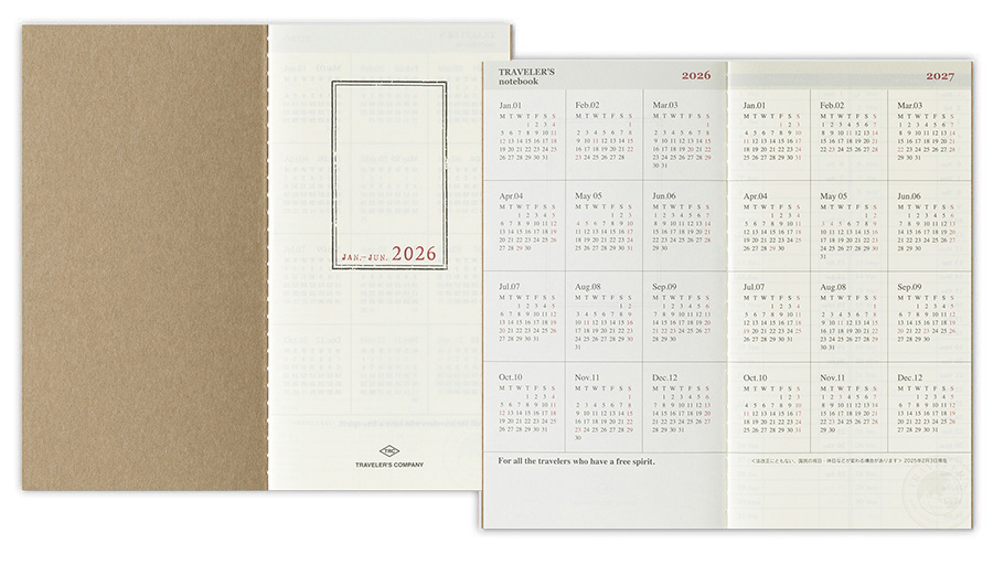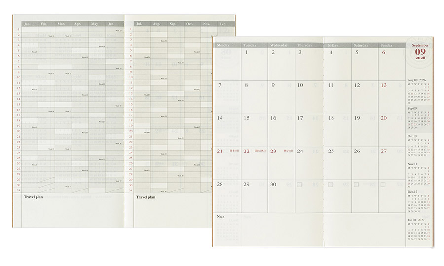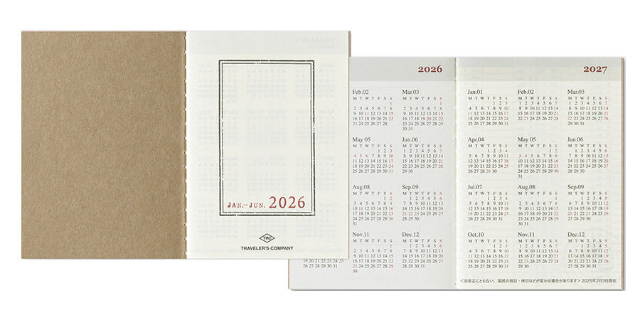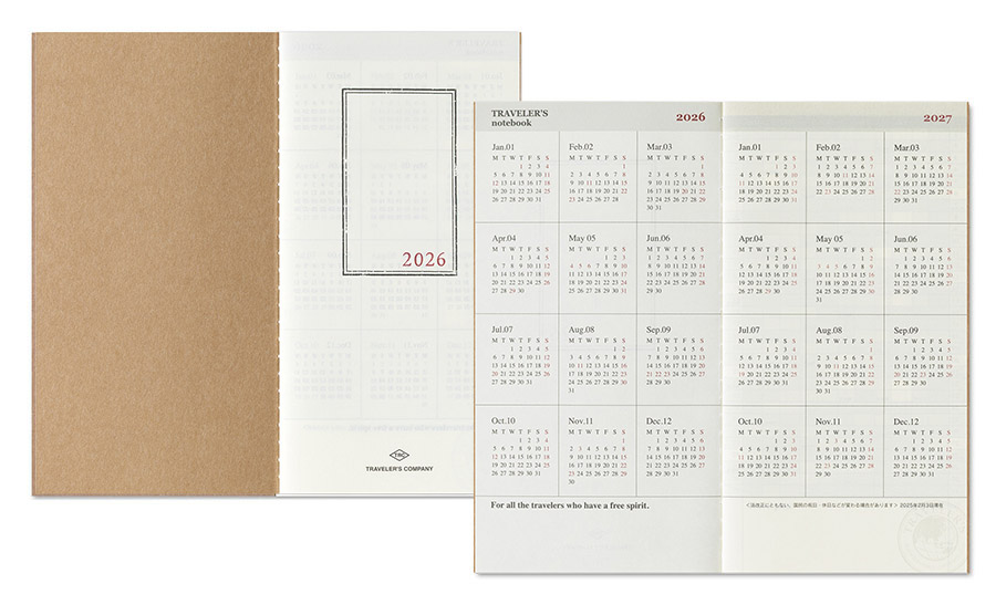 Este es el Diario Mensual 2026 para el cuaderno del viajero. Este formato es el más popular y fácil de usar. El papel MD se utiliza para este cuaderno por lo que la sensación al escribir es simplemente genial.